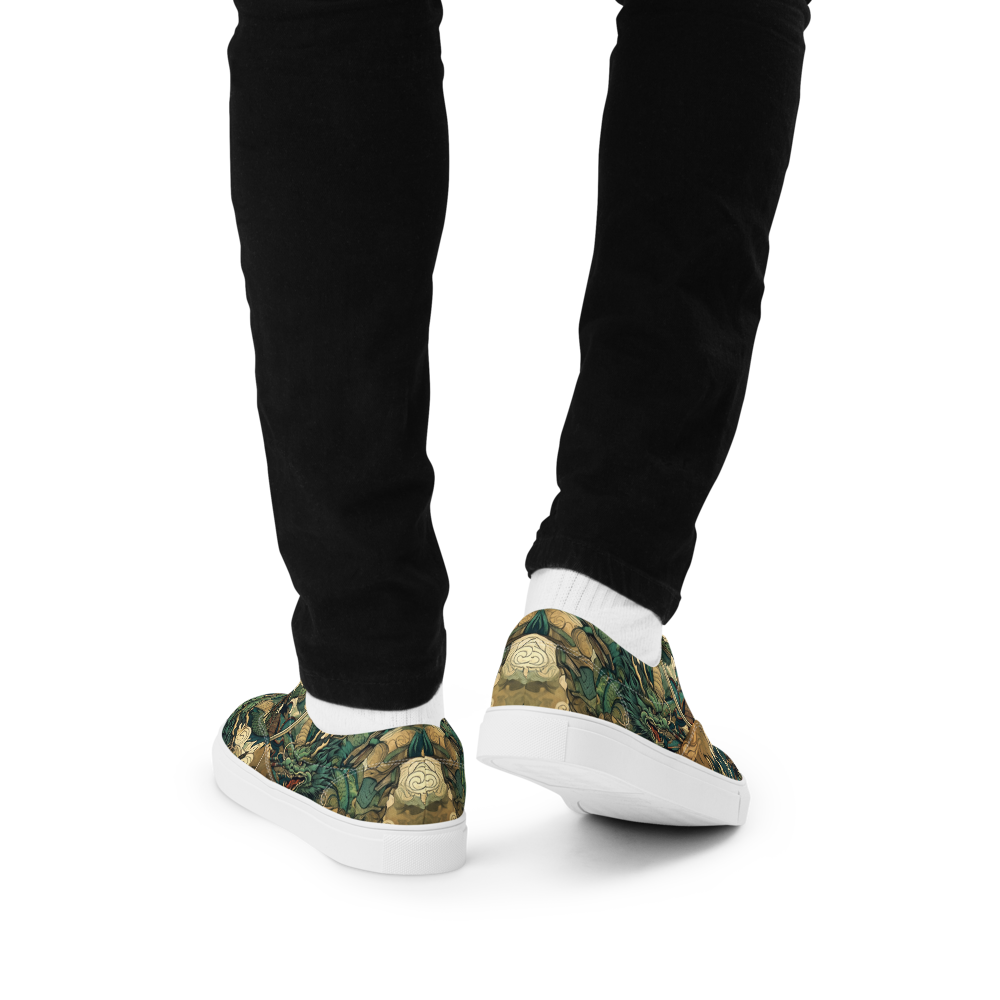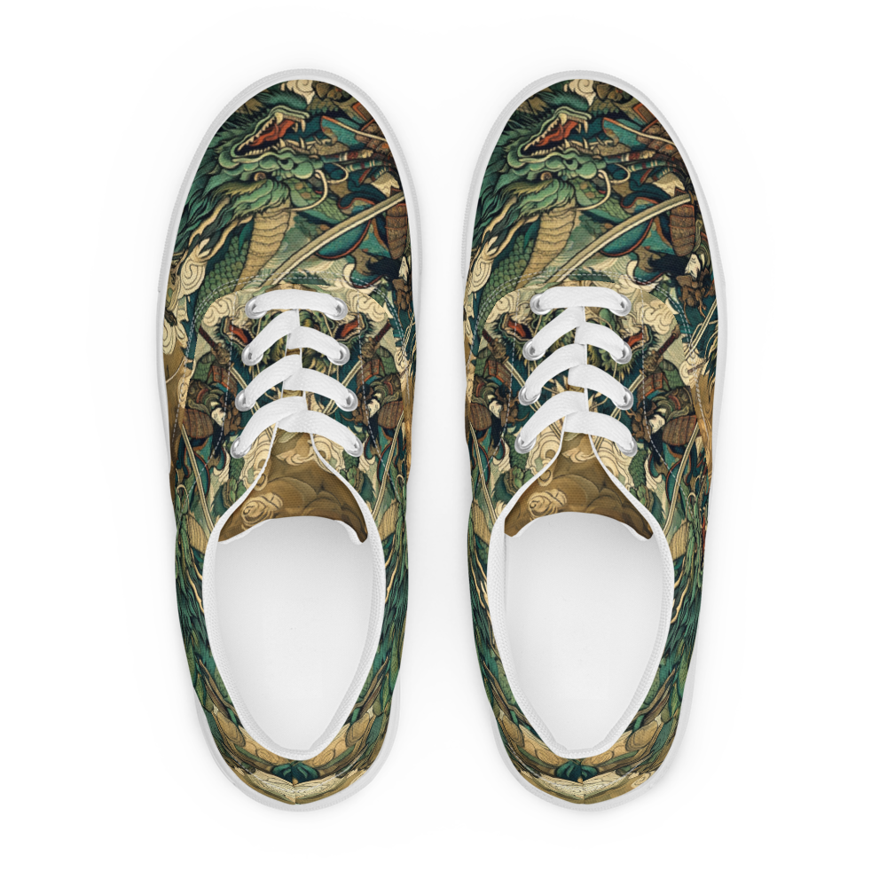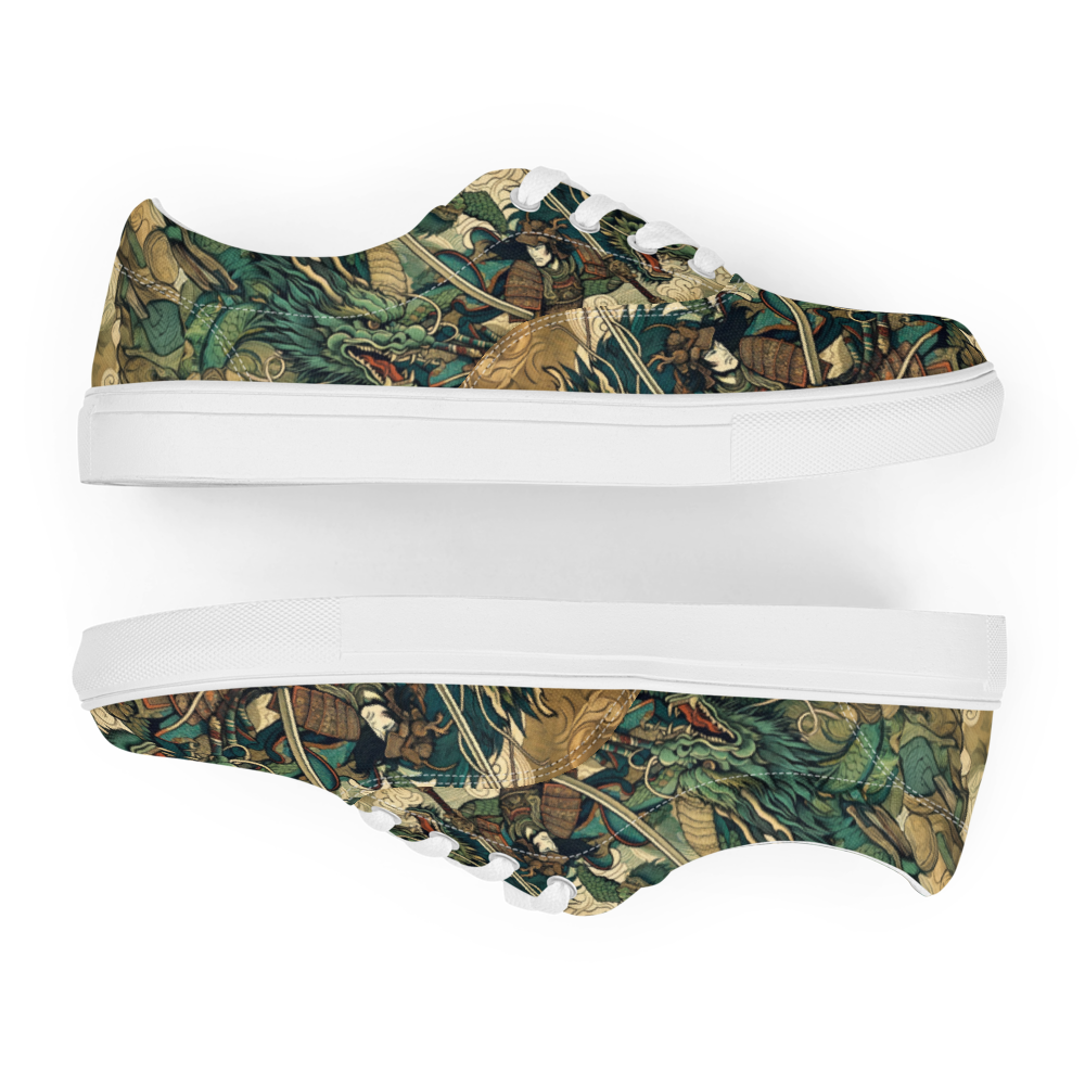 荘厳な龍が空を支配し、勇敢な神が刀を振るう姿。このシューズは、そんな火花散る一瞬の緊張感を静かに、しかし力強く伝えます。迷彩柄に見えるデザインの中に、隠された物語を探る楽しさを、履く人だけが味わえます。