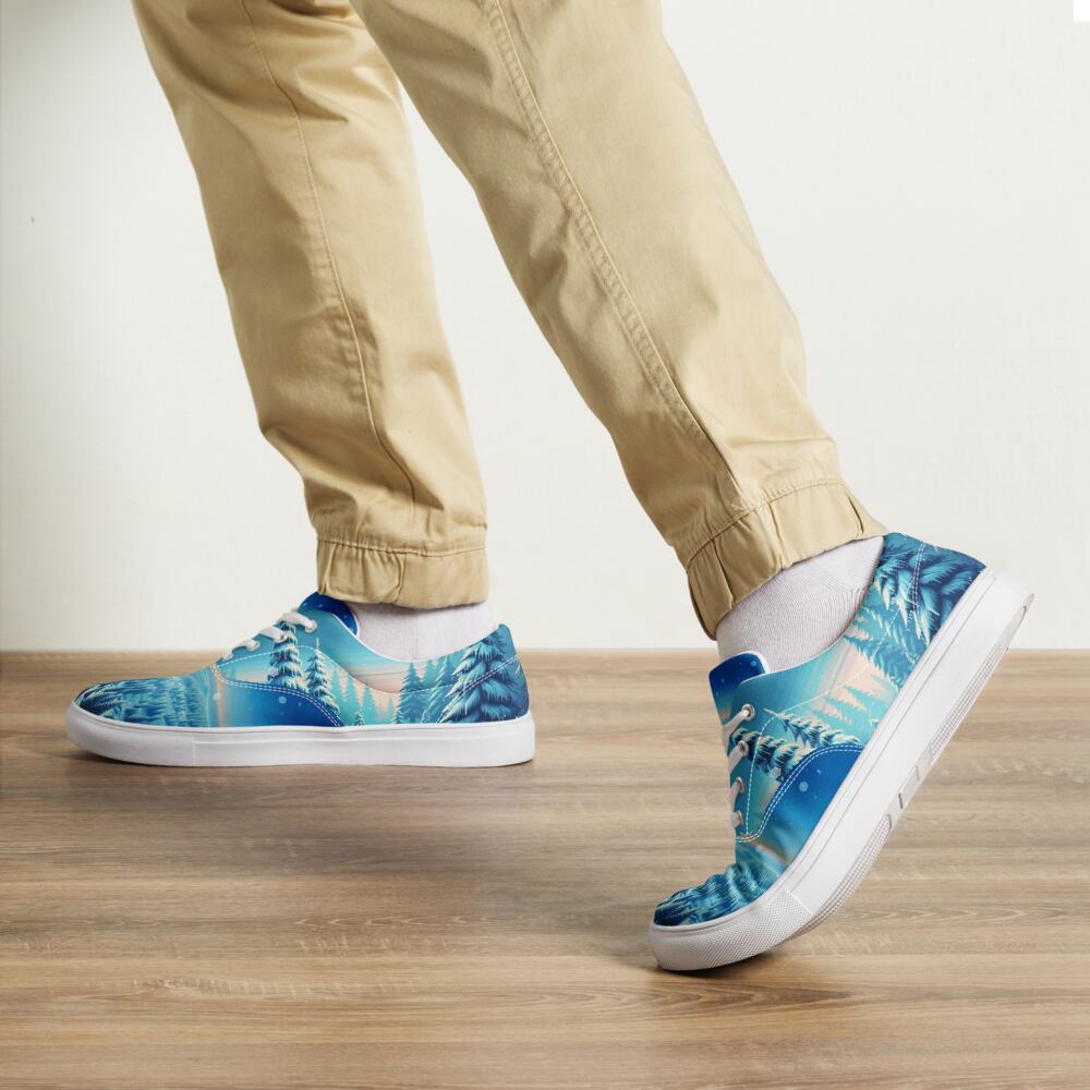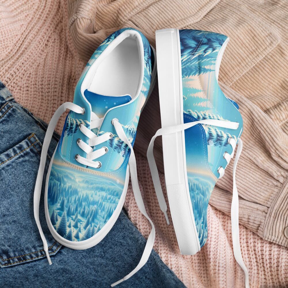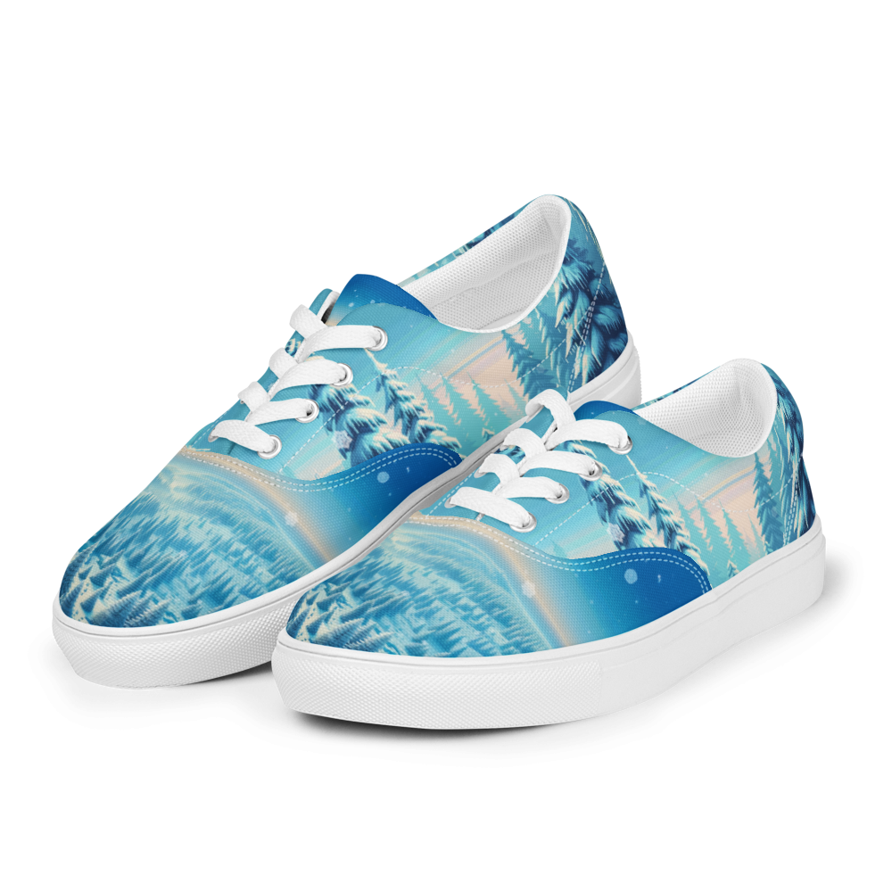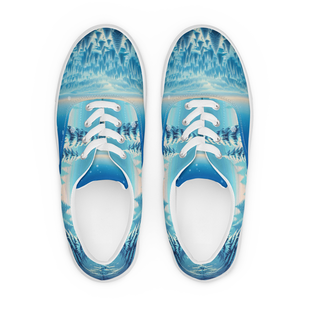 このシューズは、北欧の雪に覆われた森からインスピレーションを受け、雪の結晶と冬の森が織りなす幻想的な風景をあなたの足元に届けます。一面の雪原に佇む静寂な森をイメージしたデザインは、ライトブルーの基調に、雪の結晶が舞い散る様子を美しく表現しています。