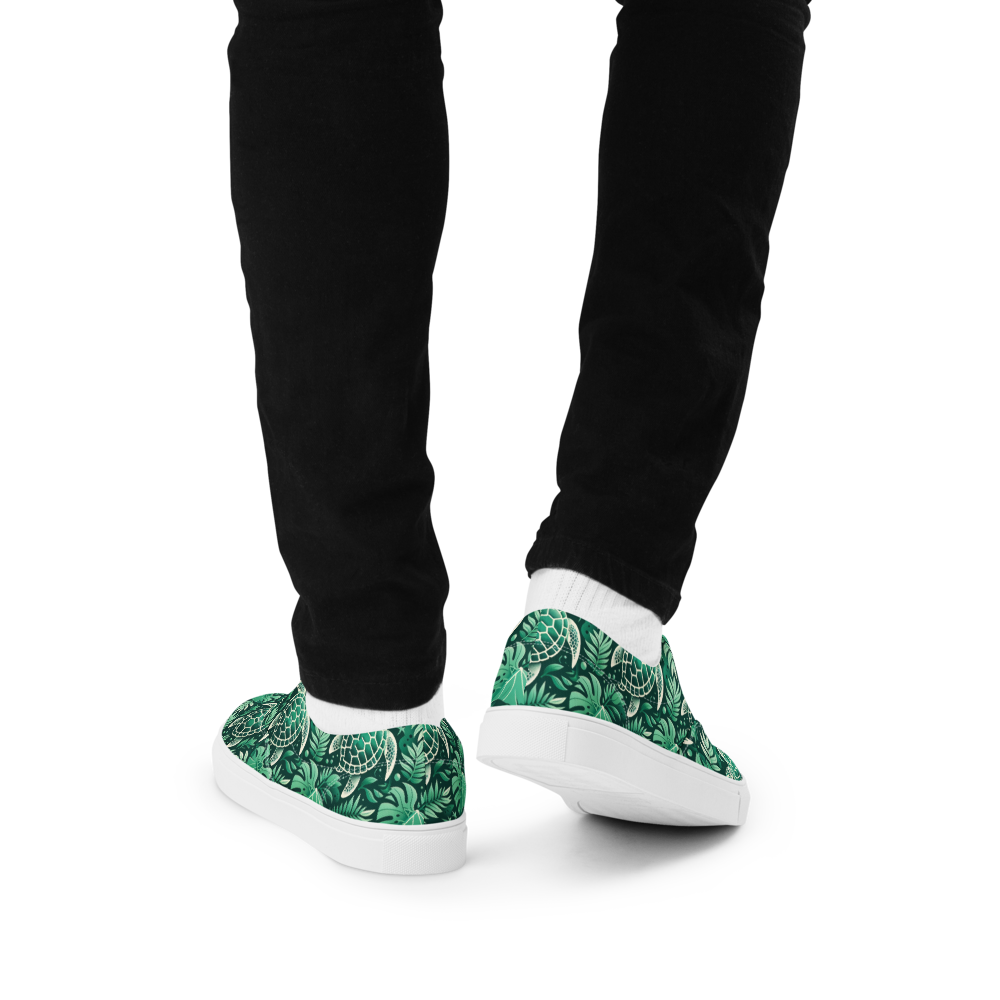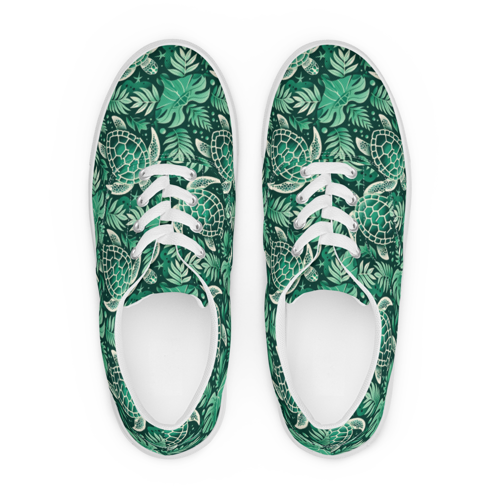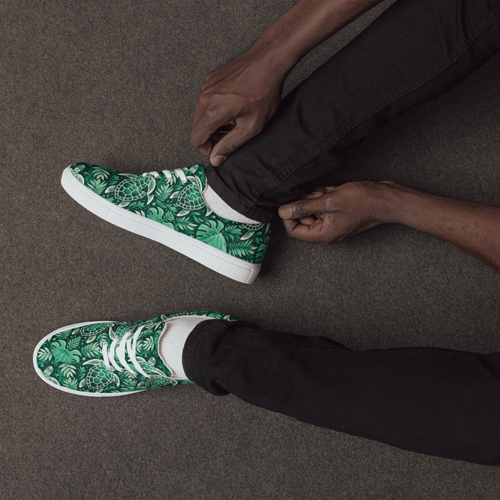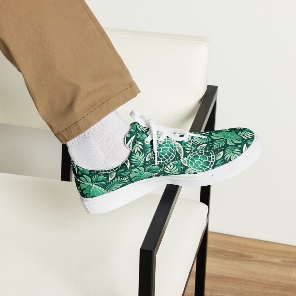 海の守り神とも称されるウミガメを描いたこのTURTLEメンズレースアップキャンバスシューズは、都会の喧騒を忘れさせるエメラルドグリーンの波間にいるかのようなデザインです。日常の足元に自然の息吹を取り入れ、リラックスした時間を演出します。