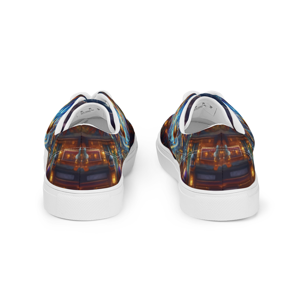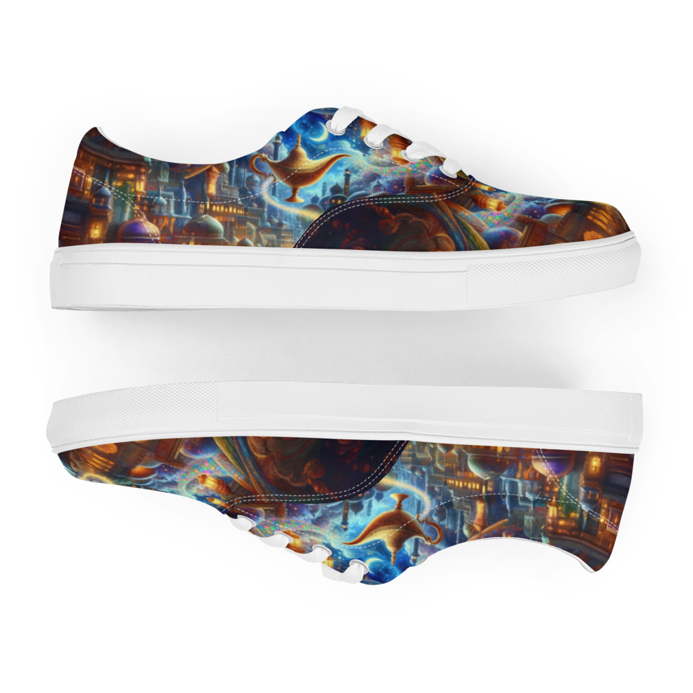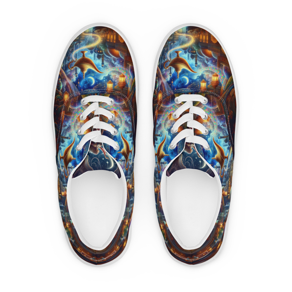 星明りの下、アラビアの夜市を彷彿とさせる幻想的なデザインが際立つ、ARABIAメンズレースアップキャンバスシューズ。物語の一ページが足元で息づくような、魔法のランプと星々が煌めく青白い月夜を表現しています。