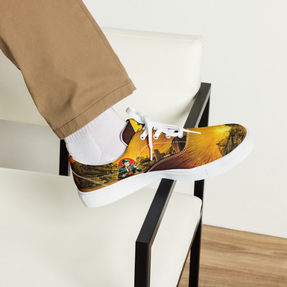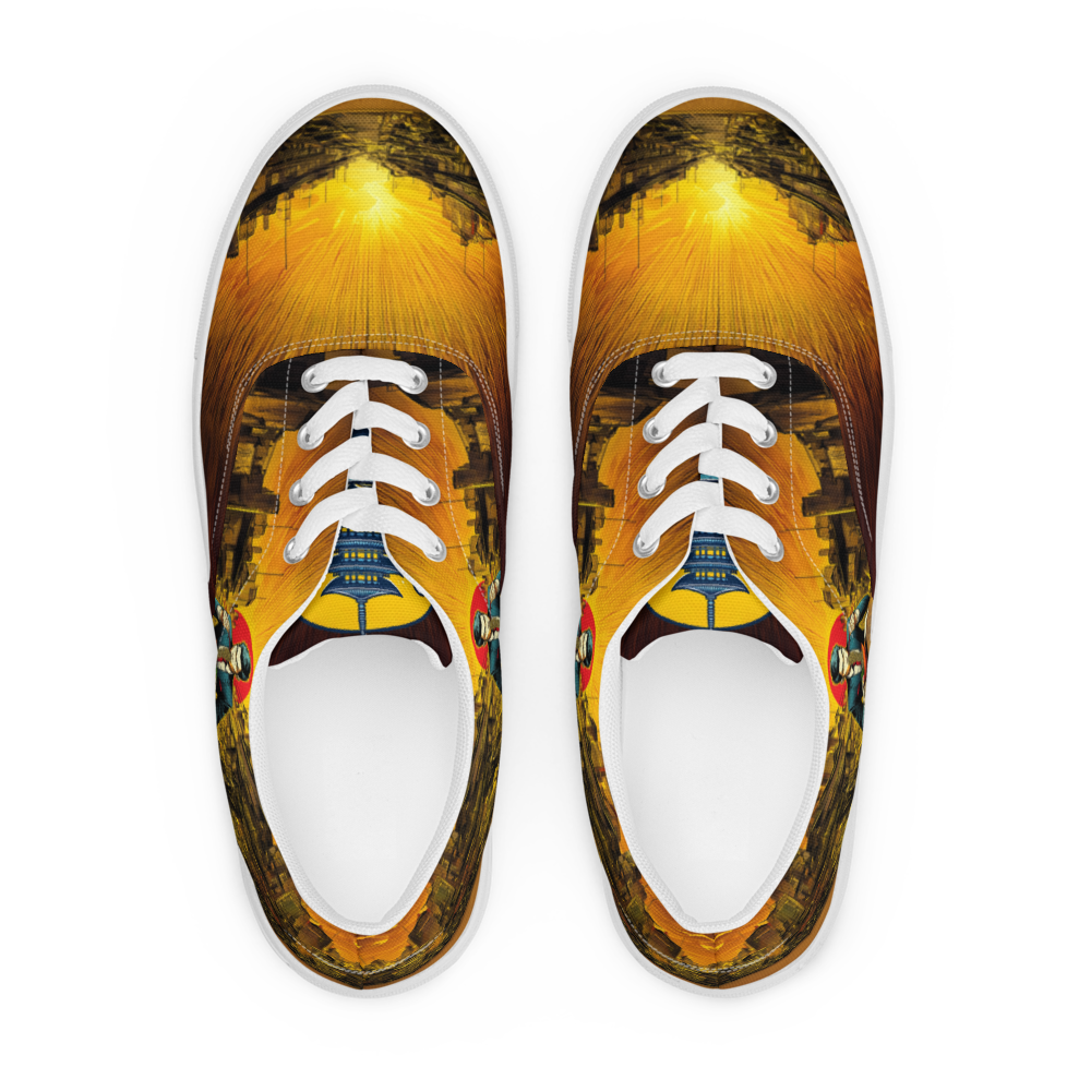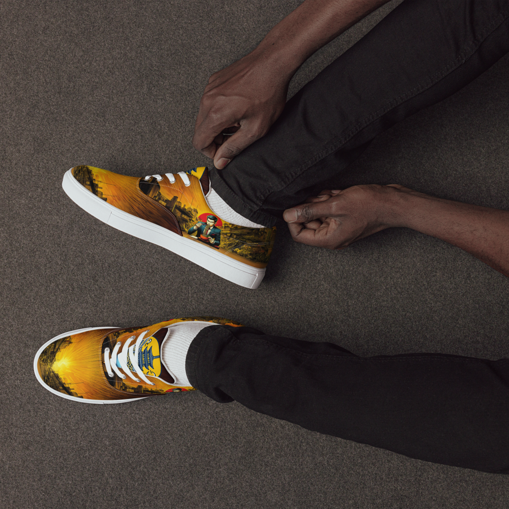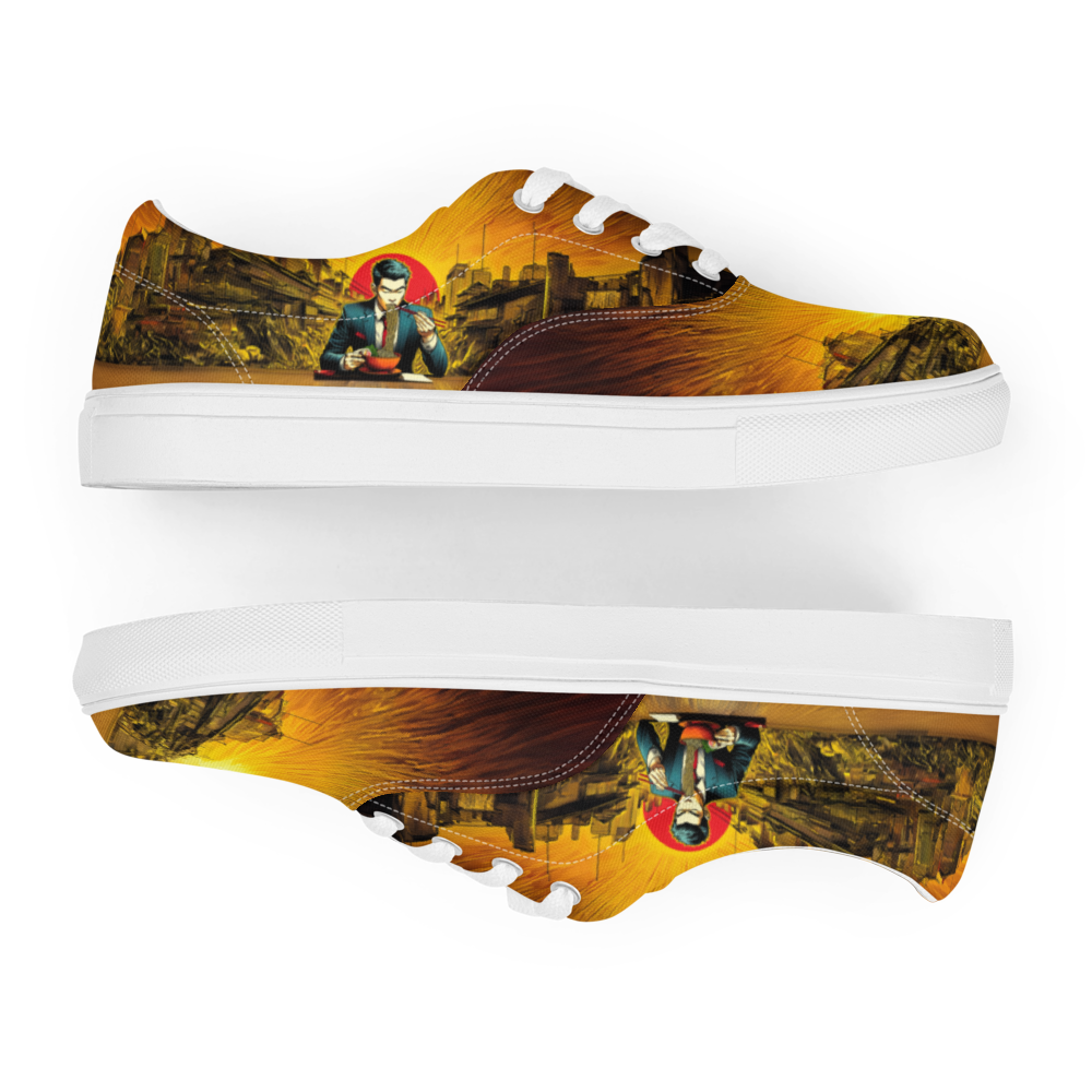 日本の街角に香るラーメンの魂を映し出す、RAMENメンズレースアップキャンバスシューズ。一日の終わりにラーメンをすするサラリーマンの情景は、日本の食文化への深い敬意と共にデザインされています。都市の夕焼けを背景に、ラーメンに込められた情熱と歴史がこの一足に息づきます。